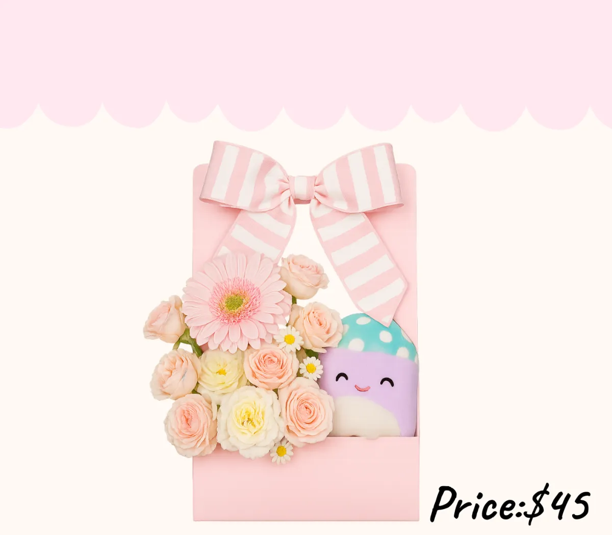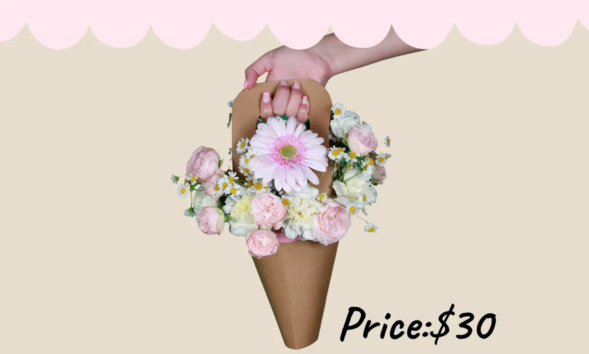 A purse-shaped arrangement filled with delicate flowers and soft colors...